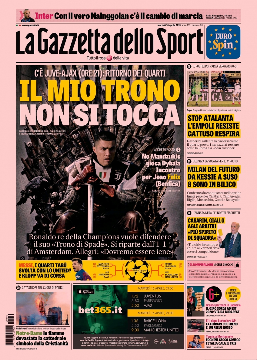 Le prime pagine dei quotidiani sportivi del 16-04-2019