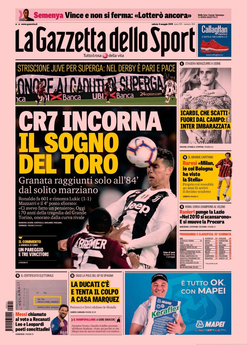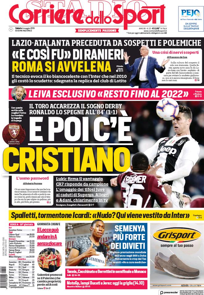 Le prime pagine dei quotidiani sportivi del 04-05-2019
