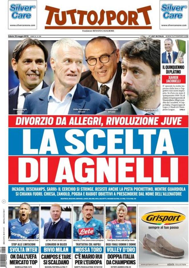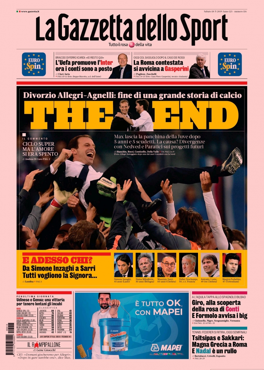 Le prime pagine dei quotidiani sportivi del 18-05-2019