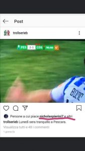 Non c’è pace per Nicholas Pierini, l’attaccante rossoblu è al centro di alcune polemiche nate sui vari social network. Tantissimi tifosi non hanno “mandato giù” i like sulla pagina instagram Trollserieb, dove appare l’immagine di Bocic che festeggia il gol del 2-1 del Pescara sul Cosenza.