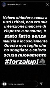 Con una stories su Instagram, il numero 7 del Cosenza ha voluto chiarire la situazione. Ecco il testo: “Volevo chiedere scusa a tutti i tifosi, non era mia intenzione mancare di rispetto a nessuno, è stato fatto senza malizia e inconsciamente, questo non toglie che ho sbagliato e chiedo scusa nuovamente”.