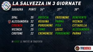 Dai 35 punti della Spal ai 22 del Crotone. In mezzo Alessandria (32), Cosenza (28) e Vicenza (25): dalla salvezza diretta al playout, cinque squadre si giocano il loro futuro in 270′. Le prossime 3 partite diranno quali saranno i club che andranno ad accompagnare il giĆ retrocesso Pordenone in Serie C. Chiaramente, con il gioco dei numeri considerato che ci sono 9 punti in palio tutto potrĆ accadere. Dal grande spauracchio che si vive in casa della Spal, complice un calendario da brividi fino alla sottilissima fiammella di speranza che tiene ancora in vita il Crotone.
