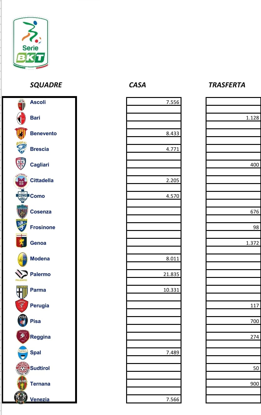 Cagliari, Reggina e Perugia occupano 6°, 7° e 8° posto della classifica dei match in trasferta con numeri un po’ più bassi di quelli appena menzionati. I sardi, nonostante la trasferta “proibitiva” di Como del 13 agosto, hanno avuto circa 400 fedelissimi al loro fianco. Gli amaranto, nella lunga trasferta di Ferrara, sono stati seguiti da 274 tifosi mentre gli umbri hanno avuto al proprio fianco 117 fedelissimi biancorossi. Ultime due posizioni della competizione con Frosinone e Sudtirol che fanno registrare 98 e 50 circa fedelissimi nelle rispettive trasferte disputate.