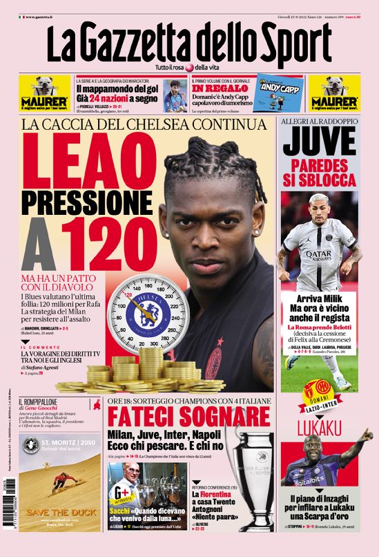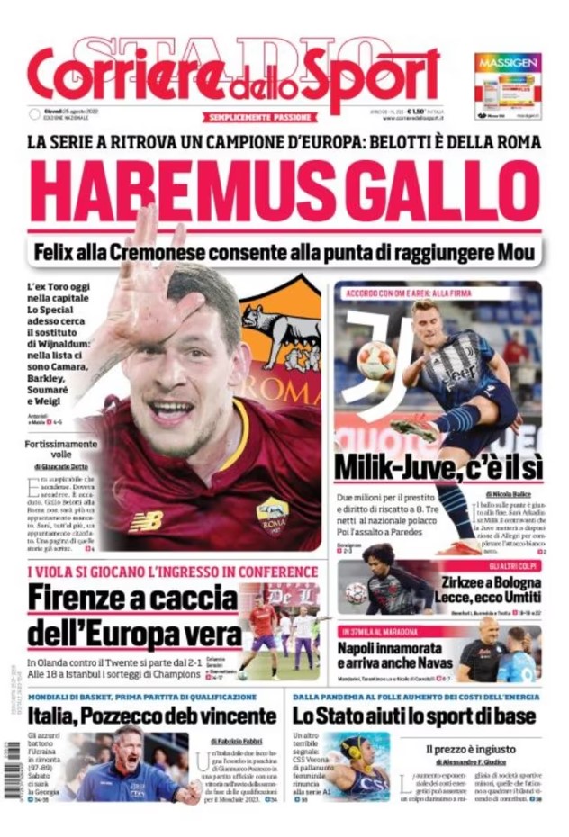 La redazione di tifocosenza.it propone ai lettori le prime pagine dei tre quotidiani sportivi in edicola oggi, giovedì 25 agosto 2022. Di seguito le prime di La Gazzetta dello Sport, Corriere dello Sport e Tuttosport. Buona visione.