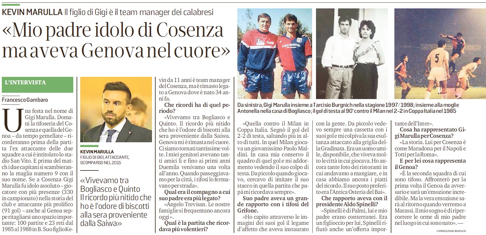 Il collega Francesco Gambaro sulle pagine del Secolo XIX ha intervistato Kevin Marulla, team manager del Cosenza, alla vigilia della sfida con il Genoa. Ovviamente si è parlato di Gigi, perché quella di sabato pomeriggio, ore 14, sarà una festa nel nome del grande capitano scomparso nel 2015. “Se a Cosenza Gigi Marulla fu idolo assoluto o giocatore con più presenze (330) nella storia del club e attaccante più prolifico (91 gol) o anche al Genoa seppe ritagliarsi uno spazio importante: 100 partite e 23 reti dal 1985 al 1988 in B”.