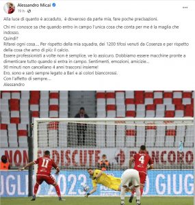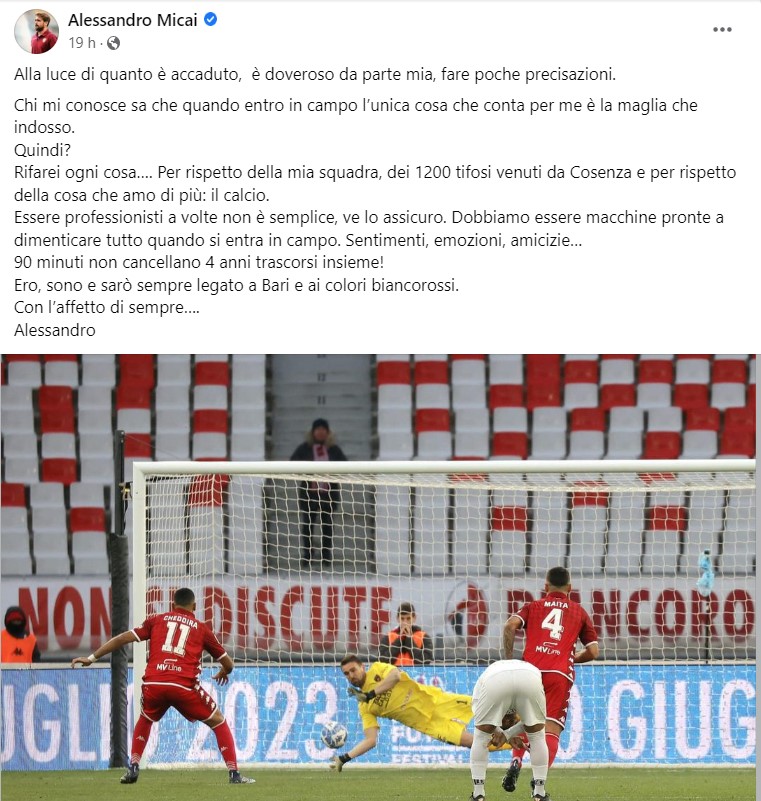 Al 46′ del primo tempo, nel recupero, Micai ha parato il rigore calciato da Cheddira. E com’è giusto che sia ha esultato assieme ai compagni di squadra. Sui social si è scatenato l’inferno contro quello che è stato ex portiere del Bari. Lo hanno accusato di avere mancato di rispetto ai tifosi baresi e alla squadra. Ci ha pensato lo stesso Micai a rispondere con un post sulla propria pagina Facebook.