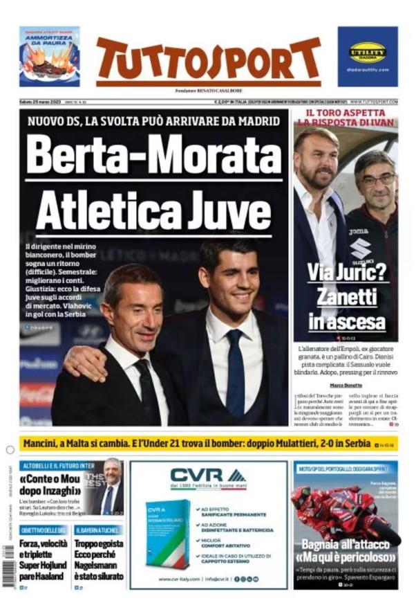 La redazione di tifocosenza.it propone ai lettori le prime pagine dei tre quotidiani sportivi in edicola oggi, sabato 25 marzo 2023. Di seguito le prime di La Gazzetta dello Sport, Corriere dello Sport e TuttoSport. Buona visione.