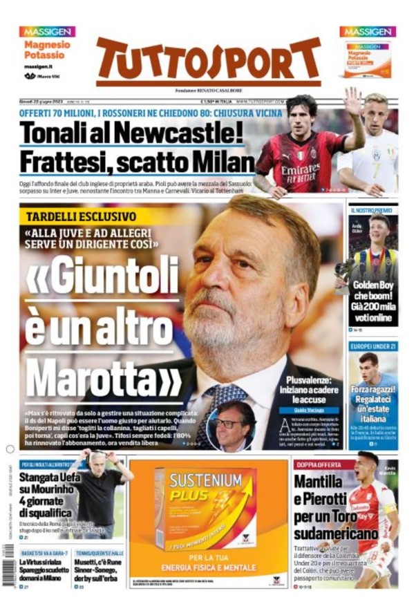 La redazione di tifocosenza.it propone ai lettori le prime pagine dei tre quotidiani sportivi in edicola oggi, giovedì 22 giugno 2023. Di seguito le prime di La Gazzetta dello Sport, Corriere dello Sport e TuttoSport. Buona visione.