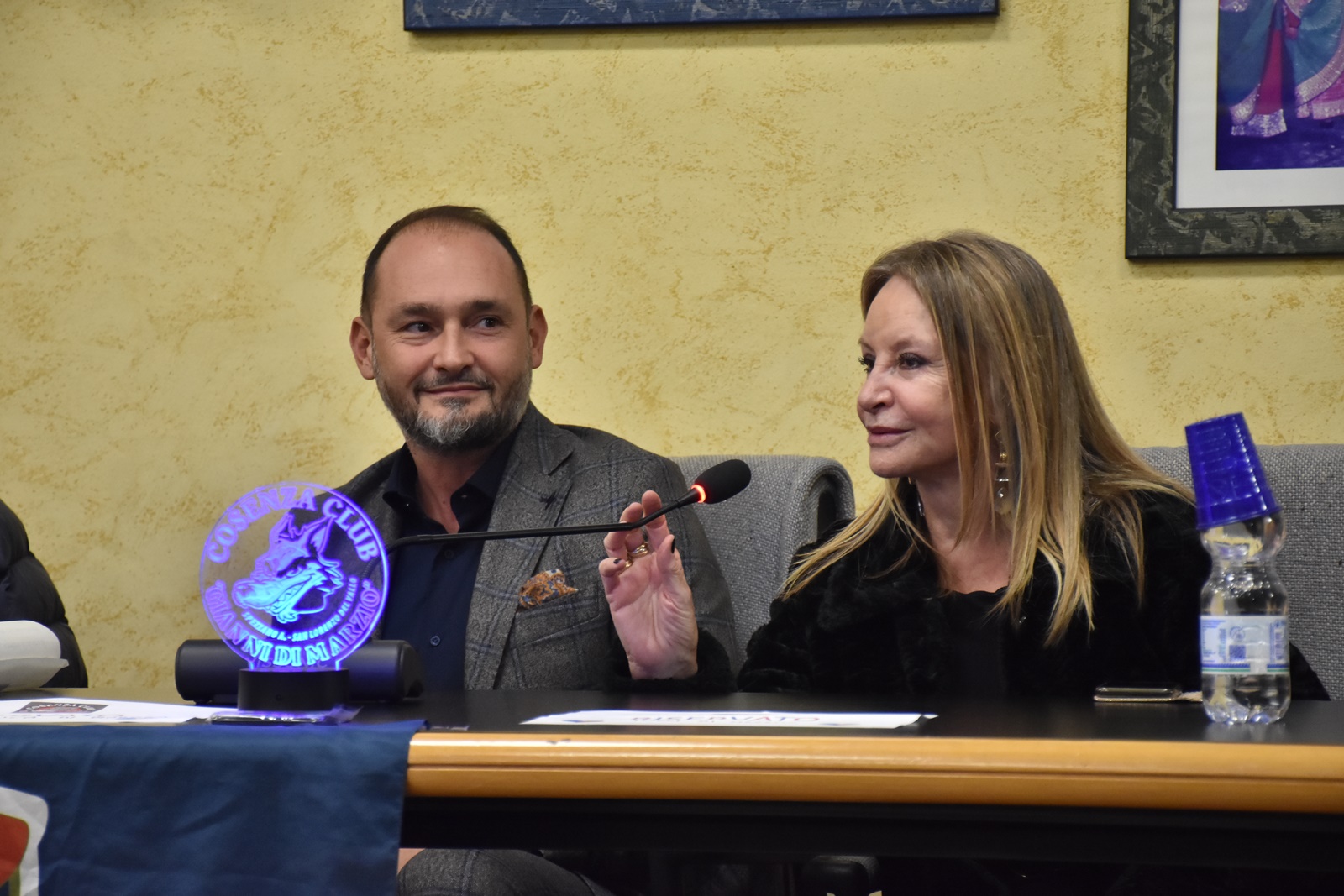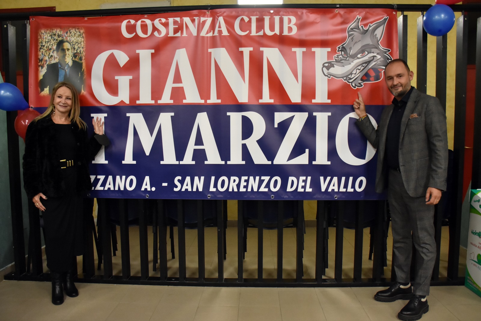 In foto: Tucci e Gianluca Di Marzio davanti allo striscione del Cosenza club Gianni Di Marzio