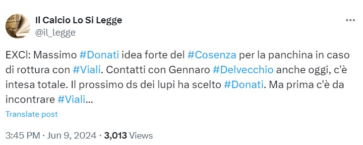 Capitolo allenatore. Su William Viali il patron rossoblù non ha mai manifestato un particolare feeling: il ritorno sulla panchina dei Lupi lo ha “subito” da Gemmi, perché il suo obiettivo era quello di riportare Bisoli. Ma con la nuova gestione sportiva qualcosa cambierà. Già nei giorni scorsi, il 9 giugno esattamente, su Il Calcio Lo Si Legge, profilo X, era stata pubblicata l’indiscrezione su Massimo Donati. Sarebbe lui il prescelto di Delvecchio nel caso in cui si arriverà all’addio con Viali. Sull’ex Legnago Salus ci sarebbe anche l’interesse dell’Athens Kallithea club neo promosso nella Serie A greca.