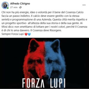 “Chi non ha più energie, idee o volontà per il bene del Cosenza Calcio faccia un passo indietro. Il calcio deve essere gestito con la stessa serietà e programmazione di una Azienda. Questa città merita rispetto e un progetto sportivo all’altezza della sua storia e della sua gente. Ai tifosi dico: non smettiamo di lottare per i nostri colori, perché il Cosenza è di chi lo ama davvero. Il Cosenza deve Risorgere. Sempre Forza Lupi”.