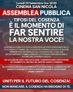Dopo alcune settimane di attesa e indiscrezioni, arriva finalmente l’ufficialità: il tifo organizzato ha indetto un’Assemblea pubblica che si terrà il prossimo 29 settembre presso il cinema San Nicola per discutere del futuro del Cosenza Calcio.